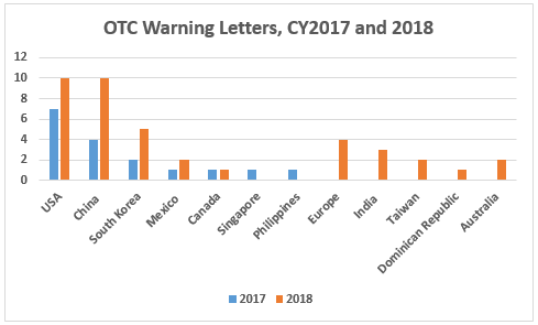 - The number of warning letters issued to OTC manufacturers more than doubled between CY2017 and CY2018, from 17 to 39. More countries, 10 vs. seven, were associated with these warning letters in CY2018. (Table 3 and Figure 4)