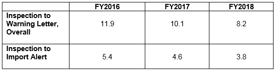 - Intervals between the inspection and enforcement actions, including issuance of a warning letter or import alert.