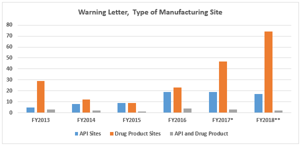 FY2018 warning letters issued to API sites decreased slightly compared to FY2017. The number of warning letters issued to drug product sites increased over 50 percent from 47 in FY2017 to 73 in 2018. This is likely associated with the increase in warning letters issued to OTC manufacturers from 17 in CY2017 to 39 in CY2018.