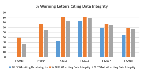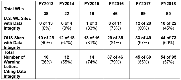 - The percentage of warning letters that cite deficiencies in data governance/data integrity decreased from the high point of 81 percent in FY2016 to 60 percent for firms outside the U.S. Those issued to U.S. firms decreased from 73 percent in FY2016 to 45 percent in FY2018. Data integrity deficiencies are cited in 57 percent of all warning letters, excluding those issued to compounding pharmacies, down from a high of 79 percent in FY2016. (Table 6 and Figure 5)