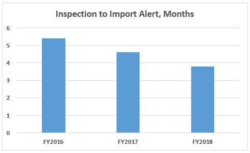 Table 8 and Figure 7 show that the interval between the inspection and imposition of an import alert decreased in FY2018 compared with FY2017. These data include only those associated with warning letters and may not be representative of import alert timing for firms that do not receive a warning letter. Though only three years are represented here, the time interval has consistently decreased. The import alerts addressed here include failure to follow GMPs (Import Alert 66-40) and refusal of inspection by a foreign establishment (Import Alert 99-32).