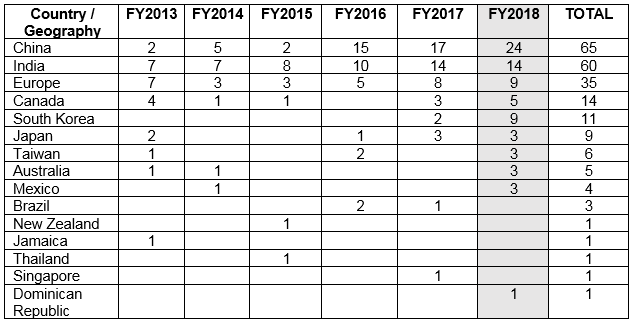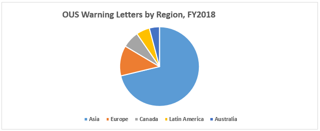 China continues to lead as the country receiving the highest number of warning letters, as it did in FY2017. This year saw the addition of the Republic of (South) Korea to the countries whose companies received an increasing number of warning letters. I would expect this to continue into FY2019.