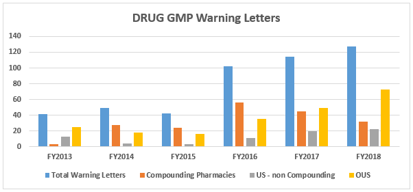 FY2018 saw another year of increase in the number of drug GMP warning letters issued by the FDA, though it is not as dramatic a difference as in some previous years.