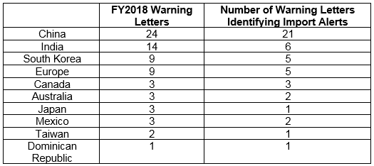 - Import alerts were associated with 48 of the 73 warning letters issued to sites outside the U.S. in FY2018. Firms in China, India, and Korea that received warning letters were the subject of 32 of the 48 import alerts associated with warning letters. China was also in first place here, with 21 of the 24 firms that received warning letters being subject to import alerts. (Table 5)
