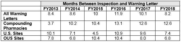 - The interval between inspection and issuance of warning letters continues to decrease for all categories, though the most dramatic decrease has been for warning letters issued to sites outside the U.S. Warning letters issued to compounding pharmacies and outsourcing facilities continue to take the longest time to issue after inspections are completed. The interval between inspection and issuance of import alerts continues to be just under 50 percent of the time between inspection and warning letter issuance. (Tables 7 and 8 and Figures 5 and 6)