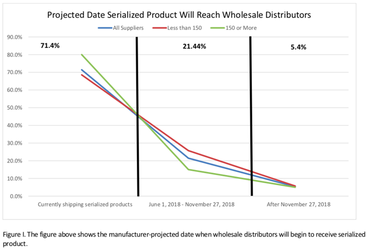 In the case of the larger manufacturers — those with 150 or more product lines — that number was 80%. The HDA report pointed out that among respondents, only 5% indicated wholesale distributors would receive their first serialized product after November 27, 2018.