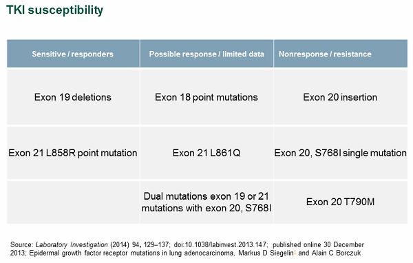 As a case study, we investigated EGFR in lung adenocarcinomas. In this specific context, a simple EGFR negative/positive report is insufficient to make informed therapy selection decisions. Studies have shown that susceptibility to the tyrosine kinase inhibitors (TKIs) gefitinib and erlotinib can vary greatly depending on the specific EGFR mutation pattern (see Figure 4).