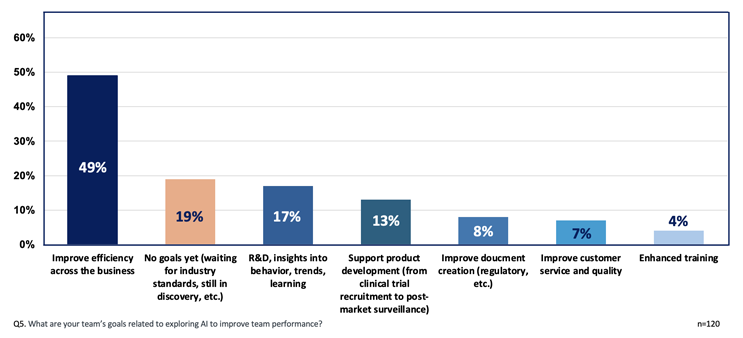 Teams should prioritize AI innovation as a core component of company strategy. Recent data shows that more than 80% of life sciences companies have included objectives around AI in their goals. Many are currently focused on delivering AI solutions that help them improve efficiency and shorten aspects of the drug development process. As part of this prioritization, look to assess AI advancements based on their business impact for the life science organization, regulatory requirement support, and overall feasibility before implementing.