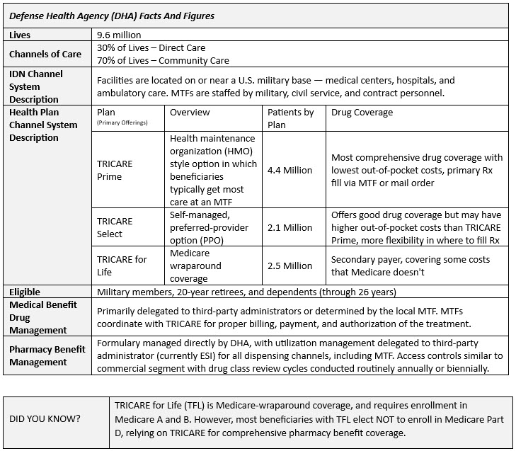 The DHA is a U.S. federal government agency that administers health services to the United States military. It is a component of the MHS and is responsible for the overall management of the MHS, including its drug management program. DHA was established in 2013 to align resources across the individual services and, since that time, has grown its workforce to over 130,000 healthcare professionals and streamlined care delivery to nine Defense ‘Health Networks.’ A unique-to-government element of DOD healthcare is TRICARE. TRICARE offers comprehensive healthcare coverage through its 11 different healthcare plan options depending on where an individual lives and that individual’s connection to the military. TRICARE is accepted at both direct care sites and participating community care providers. It functions similarly to traditional commercial health insurance with its tiered drug formulary and co-pays. However, while TRICARE functions like private health insurance, it is not technically health insurance due it is funding source and targeted beneficiary population.