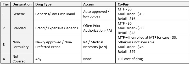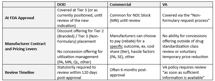 The DOD Uniform Formulary is analogous to a commercial plan, with most expensive new market entrants being placed in the “non-formulary” tier 3 category. It’s important to remember that exclusion tier aside (Tier 4), the DOD formulary is essentially a three (3) tier drug management system. That means that the “branded” tier on DOD is akin to a preferred brand tier and the non-formulary tier is comparable to a commercial branded or specialty tier.