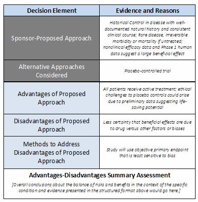 Table 1 shows a hypothetical example of how a sponsor might fill out the Advantages-Disadvantages Framework in preparation for a meeting with FDA staff. In this case, the arguments are for use of a historical control arm in a pivotal clinical trial.