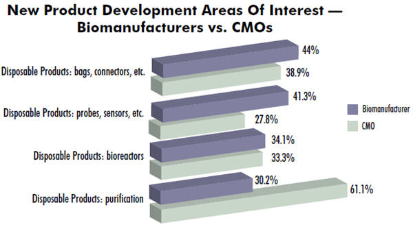 In our 10th Annual Report and Survey of Biopharmaceutical Manufacturers, we measured 21 different areas where new product development was sought. We evaluated the categories by biomanufacturer (drug innovators) vs. CMOs. We found significant differences in responses. For example, regarding standard, common bags and connectors, CMOs already had implemented these devices years ago and are now seeking innovation in emerging areas such as single-use purification.