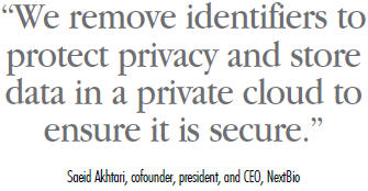 “One of the drivers for the advances in Big Data in healthcare research is the improved efficiency in producing molecular profiles, as sequencing costs are falling,” says Saeid Akhtari, cofounder, president, and CEO of NextBio. “Each patient whose data is added to the system makes it smarter.”