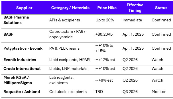 The supplier landscape shows early-stage inflation concentrated in APIs, excipients, and engineering polymers, with additional categories entering the cycle. Confirmed supplier actions indicate that cost escalation has already begun, while watch-list suppliers suggest further increases in Q2 2026.