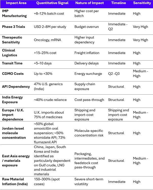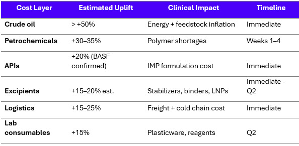 The disruption propagates through a structured cost cascade, beginning with energy markets and extending into clinical development (Table 2). The data indicates a layered cost transmission mechanism. Energy price increases feed into petrochemical shortages, which then impact APIs, excipients, and logistics. The earliest effects are observed in APIs and freight, while lab consumables and secondary materials are expected to show stronger impact in Q2 2026.