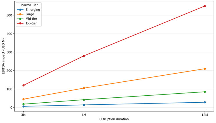 Under the base-case six-month disruption scenario, the model indicates approximately USD 280 million of incremental cost exposure for top-tier pharma, with proportionally lower but still material exposure for large, mid-tier, and emerging biopharma companies.