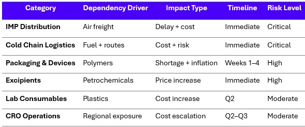The highest exposure is concentrated in logistics-dependent and polymer-dependent categories. Clinical trial supply and cold chain logistics are affected immediately, while packaging materials and excipients show direct cost escalation. Laboratory consumables and CRO operations are expected to reflect cost pressure with a delay as contracts adjust.