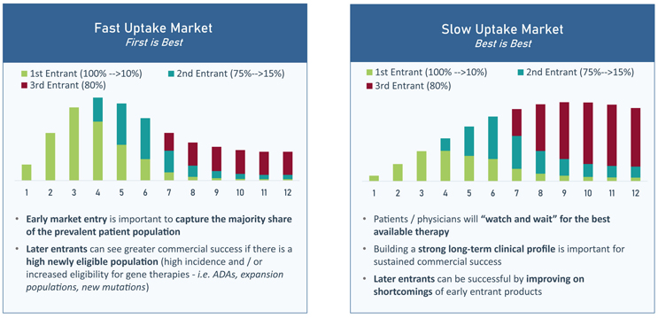 Driven by unmet need, uptake speed directly impacts the commercial upside of later-to-market entrants, as depicted in FIGURE 3. In fast uptake markets (where unmet need is high), the operating principle is “first-is-best”. The first gene therapy in a “first-is-best” market will capture the majority of the prevalent population, leaving later entrants to rely on treating primarily incident patients. In fast uptake markets, late entrants can only succeed if there is high incidence or increased eligibility for the late entrant (i.e., a different mutation/expansion population). In contrast, in slow uptake markets (where unmet need is low), patients may choose to wait for treatment, so being the first entrant is less important. In these markets, the operating principle is instead “watch and wait” or simply “best-is-best”. To have success in slow uptake markets, it is more important to build a strong long-term clinical profile, as late entrants can capitalize on the shortcomings of early products.