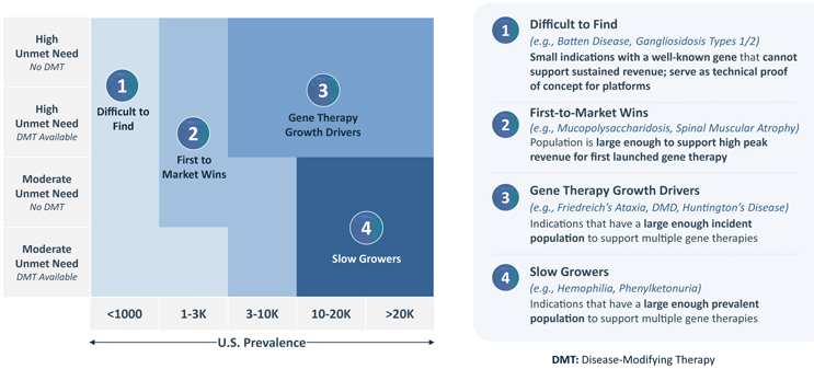 - Moderate need, but larger prevalence (10,000+ U.S. patients) indications will be “Slow Growers.” As the name implies, indications within this archetype will see relatively slow uptake, but the patient populations are large enough to sustain multiple gene therapies.