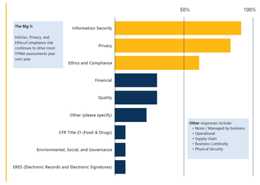 Many TPRM functions already are being tasked with building new risk domains into their programs. Beyond traditional risks (such as information security and privacy), TPRM teams are increasing emphasis on ethics and compliance; quality; environmental, social, and governance; and other related fields (see exhibit).