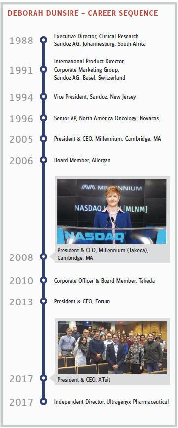 To transform: to start with a scientific hypothesis, use it to create or isolate a potentially therapeutic substance, devise and conduct bench tests, move the compound into preclinical, then clinical trials, and with a great measure of luck, finally gain approval to take the drug to market and make it available to patients. Some people disdain the drug-commercialization process as fraught with fraud and conflict of interest. Others celebrate it as … pure magic. In the latter camp would be Deborah Dunsire, who has lived and worked in a world driven by commercial drug development for three decades.