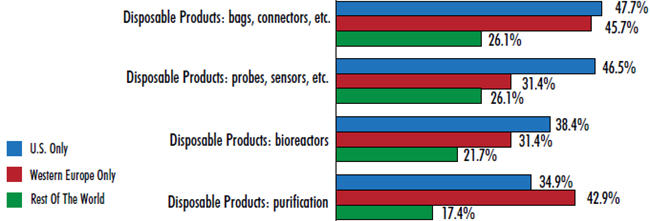 It’s no surprise, then, that disposable bags and connectors top the areas in which the industry is demanding innovation and better products. When we asked respondents where they want their suppliers to focus their new product development efforts, a leading 44 percent pointed to basic devices such as disposable bags and connectors. This response ranked 4 percent above the next mostdesired innovation (disposable probes and sensors, at 40 percent). Other disposable devices also appear near the top of the list, including innovation in disposable bioreactors and disposable purification products.