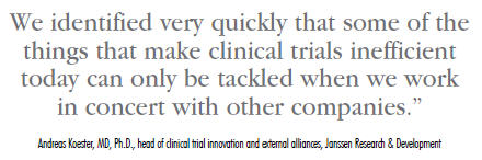 Andreas Koester, MD, Ph.D., was at the J&J meeting. “We identified very quickly that some of the things that make clinical trials inefficient today can only be tackled when we work in concert with other companies,” recalls Koester, head of clinical trial innovation and external alliances at Janssen Research & Development. Many others have reached the same conclusion, but putting those simple words into action is tough. Most Big Pharma firms have tried to do it by forming precompetitive collaborations with rivals and academia. But it is tough for two companies to even agree on what information is precompetitive. Successful precompetitive collaborations only occur when multiple companies put aside traditional rivalries and adopt new ways of thinking about drug development and their respective roles within the industry. It is a big challenge.