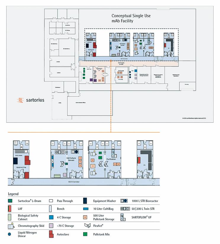 Sartorius has developed modular facility concepts. Modular containers offer flexible modular systems that are perfect examples of how to enable the industry to cope with the challenges of the future. Figure 2 illustrates the application of such technology to a typical mAb facility equipped with Sartorius’ single-use process platform technologies.