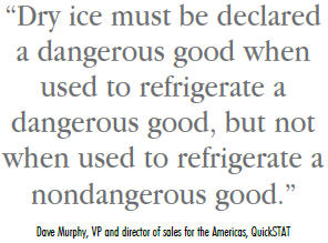 As Murphy adds, “Dry ice must be declared a dangerous good when used to refrigerate a dangerous good, but not when used to refrigerate a nondangerous good. Quantities above 2.5 kg must be declared on the airline air bill and must ride as cargo. In contrast, dry vapor shippers, which use liquid nitrogen, are not considered dangerous goods.”