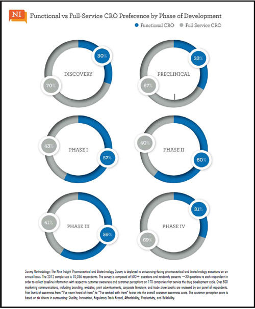 Nice Insight research has shown outsourcing preferences frequently vary across different buyer groups, and the inclination to use one outsourcing method over another is no exception. As a matter of fact, not only does the preferred method vary by sponsor category, the decision to use a functional or full-service CRO is heavily influenced by the phase of development. With the exception of Big Pharma — who display parity interest in using full-service or functional CROs — respondents show a strong preference towards engaging a full-service CRO for Discovery phase projects (70%). This is also true of preclinical phase outsourcing, where 67% of respondents indicated a preference for a full-service CRO, yet Big Pharma preferences remain even.