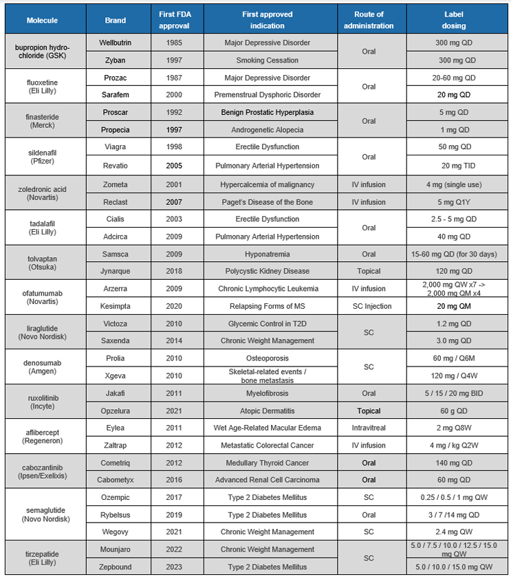 Recently, there has been heightened focus on dual brand approaches in which the same molecule is approved for multiple indications and packaged, priced, and distributed under different brand names. Public interest has centered on Novo Nordisk’s semaglutide, with its dual brands Ozempic1 (type 2 diabetes) and Wegovy2 (weight loss), both once-weekly self-administered subcutaneous injections (a third brand of semaglutide, Rybelsus, is an oral formulation administered once daily). Ozempic and Wegovy are available with different dosage strengths (Ozempic in three strengths, Wegovy in five) and at different prices per pen and per unit. Ozempic’s monthly list package price is approximately $969 compared with Wegovy’s approximate $1,349.3 Given relatively limited differences in dosage strengths and labeled dosing for the two brands, the price difference has led to many patients requesting, and providers prescribing, Ozempic for weight loss. In addition, many payers have applied utilization management through prior authorization criteria to limit Ozempic use to patients with type 2 diabetes, as they typically would not reimburse for weight loss medications. Dual branding of semaglutide, with high-profile celebrity testimonials, has shone a light on dual brand benefits and complications as patients attempt to minimize out-of-pocket costs. Recently, Eli Lilly received approval for its dual-brand medication Zepbound (tirzepatide injection), a once-weekly therapy for weight loss, following its 2022 approval as Mounjaro for treating type 2 diabetes.
