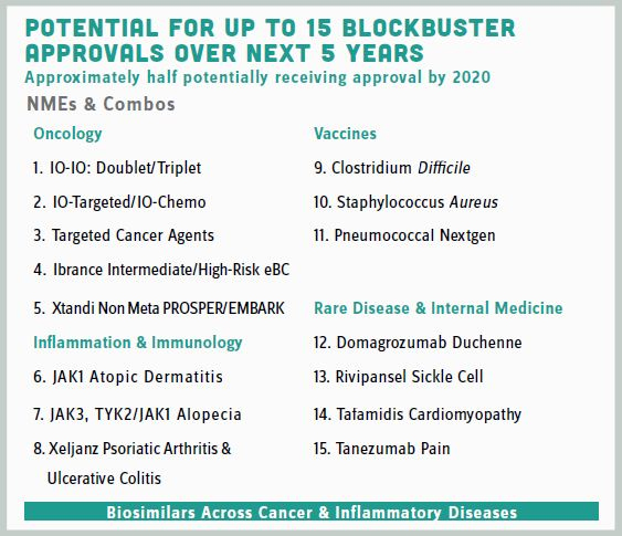 Pfizer is at about the halfway point on its 15 in 5 plan, and according to Dolsten, there have been more successes than failures. Still, the company remains cautiously optimistic, with Dolsten frequently reminding people that not all 15 products will be blockbusters, and some will likely fail. But even with some expected pipeline attrition, Pfizer still anticipates 25 to 30 approvals by 2022!
