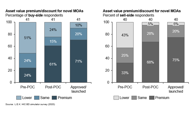 For assets with novel MOAs, POC is a key value creation inflection point. Sellers expect earlier and higher premiums than do buyers for novel assets, particularly pre-POC assets (see Figure 5).