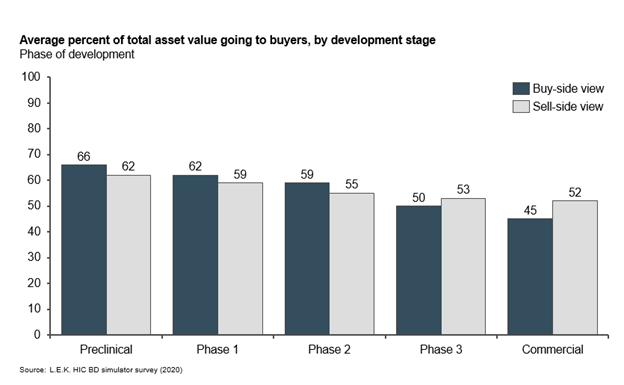 Buyers and sellers broadly agree on asset value distribution between parties for early-stage assets. For late-stage assets, sellers may assign more value to buyers than needed (see Figure 4).