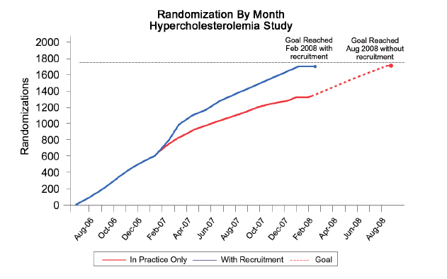 The centralized recruitment campaign, employed from the start of this study, contributed approximately 400 of the 900 patients randomized into this study. Importantly, central recruitment nearly doubled the rate of enrollment and reduced the enrollment period by nearly four months.