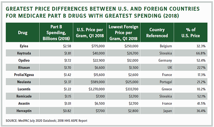 The table on the following page shows why the industry believes it has no basis to find common ground with a president who believes the U.S. should be entitled to the lowest price in the developed world. Prices in the U.S. would be slashed between 48 and 90 percent for the top-selling Part B drugs.
