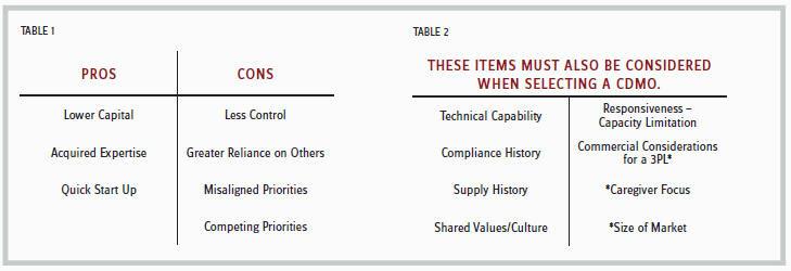 Many factors go into deciding where to develop and manufacture a product. The above scenarios simply provide broad guidelines. Considering the pros and cons of an outsourced model depicted in Table 1, the pros are quite evident — cost avoidance and speed. The cons are more difficult to assess but can have grave consequences when launching a new product. Compliance issues that arise at the CDMO can have a dramatic impact on the supply of your product. You are fully reliant on the CDMO to provide sustained compliance. While you may be intimately involved in what is occurring around your product, you do not know what is happening with other products or areas of the CDMO. In this case, what you don’t know can kill you. Unfortunately, priorities can change at a CDMO, which can negatively impact their performance. For instance, perhaps the CDMO is launching its own products and has less focus on the contract business. If your product is more successful than anticipated, you may need additional line time at the CDMO. However, it may not be available depending on line time committed to other customers of the CDMO.