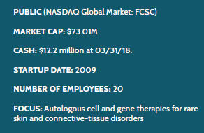 The problem is lack of collagen-7, the protein that serves to bind the skin together. Once processed to carry the related gene, FCX-007 is injected locally and intradermally around the periphery of wounds where they promote expression of collagen-7 and act like a zipper to reattach and close the skin, allowing the wound to heal. The FDA has granted FCX-007 Orphan Drug, Rare Pediatric Disease, and Fast-Track designations.