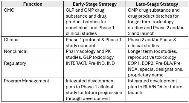 Early-stage development is the point where a development candidate has been identified based on specific biological and chemical properties and is ready to move into clinical development. The strategy here is multi-factorial, since the goal is to start the Phase 1 clinical trial, and to do so, the passport to entry is the IND application containing activities related to CMC, nonclinical, and clinical.