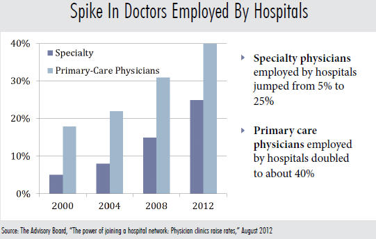 A survey by the Medical Group Management Association shows a nearly 75 percent increase in the number of active physicians employed by hospitals since 2000, while 74 percent of hospital leaders planning to increase physician employment within the next 12 to 36 months.